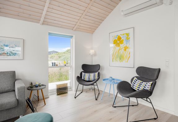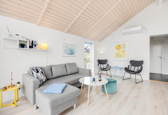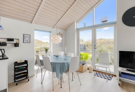 Sommerhuset på Slunden 84 byder på en lys og hyggelig indretning, hvor der både er højt til loftet og et skønt lysindfald – der er ingen tvivl om, at I straks vil føle jer hjemme her!