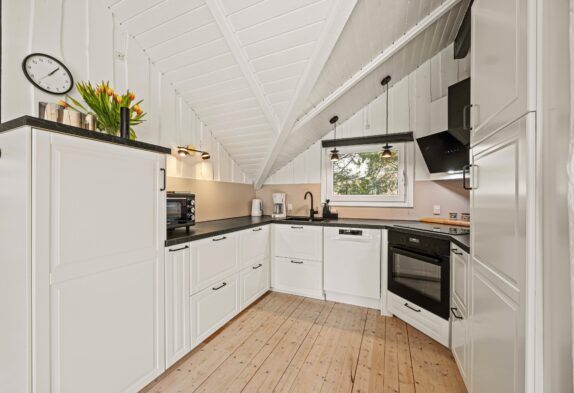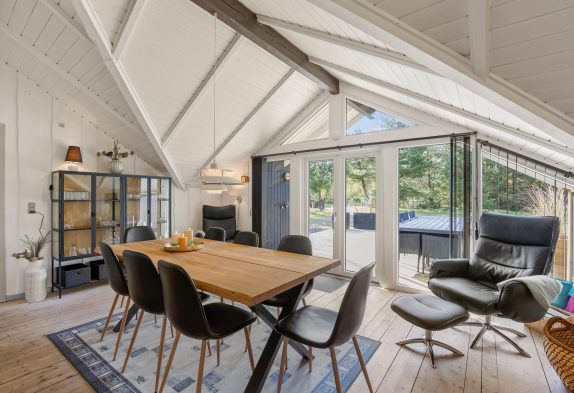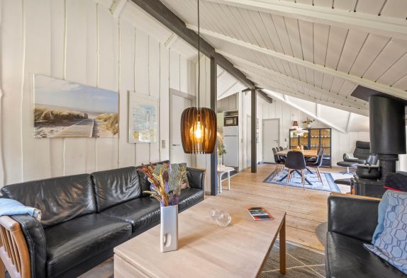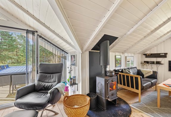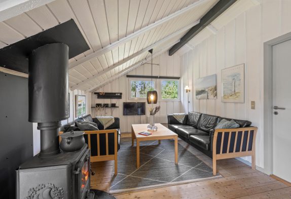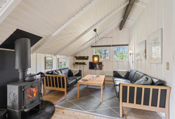Hjertet i feriehuset på Toftevej 15 i Ho er alrummet, hvor køkken, stue og spiseplads ligger i åben forbindelse. I alrummet er der lagt op til mange hyggelige feriestunder for hele familien, og her sørger brændeovnen for, at feriestemningen er helt i top.