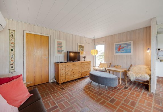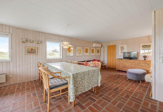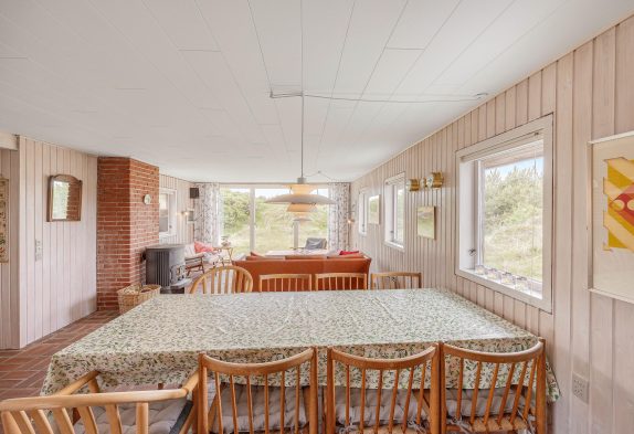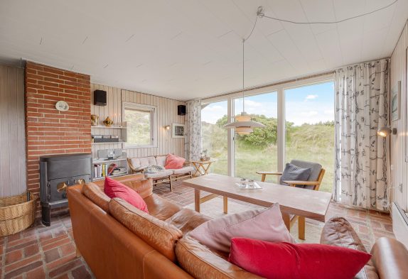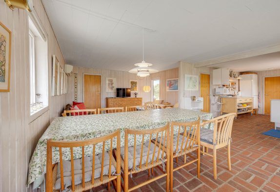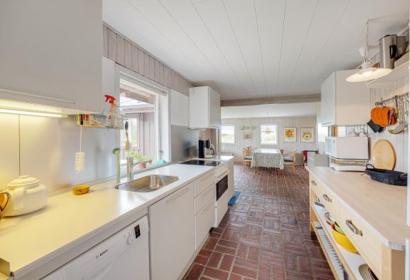 Det store samlingspunkt for jer i feriehuset er uden tvivl alrummet, hvor køkkenet ligger i åben forbindelse med stue og spiseplads. Her kan I samle hele ferieflokken til hyggelige stunder med madlavning, sjove spil og gode film. Alt imens står brændeovnen for at fuldende feriestemningen med sin varme og knitren i baggrunden.