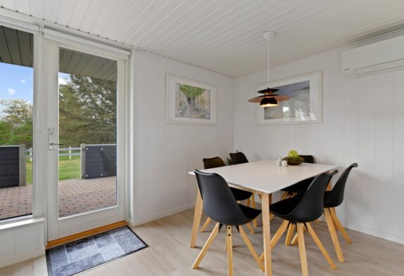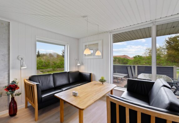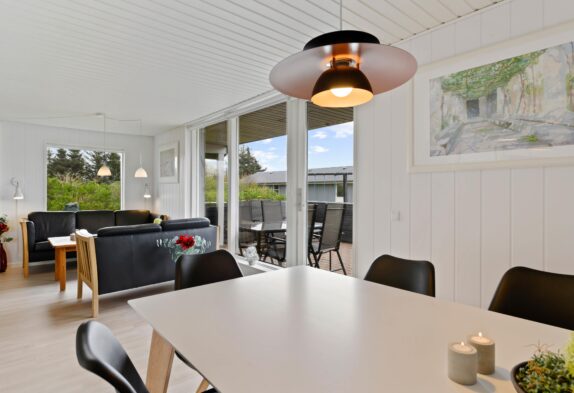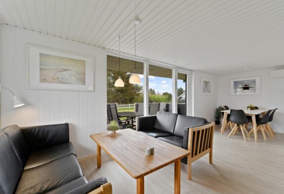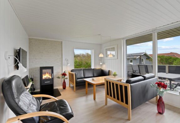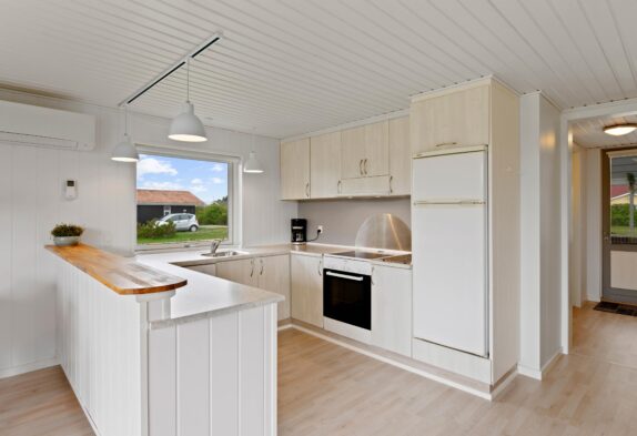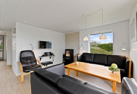 I sommerhuset vil I hurtigt føle jer hjemme med den hyggelige indretning og atmosfære. Det store vinduesparti i stuen skaber et godt og naturligt lysindfald i rummet, som ligger i åben forbindelse til køkken og spiseplads. Her er god plads til, at I kan samles til en hyggelig aften foran brændeovnen eller til en spilleaften med hele familien.