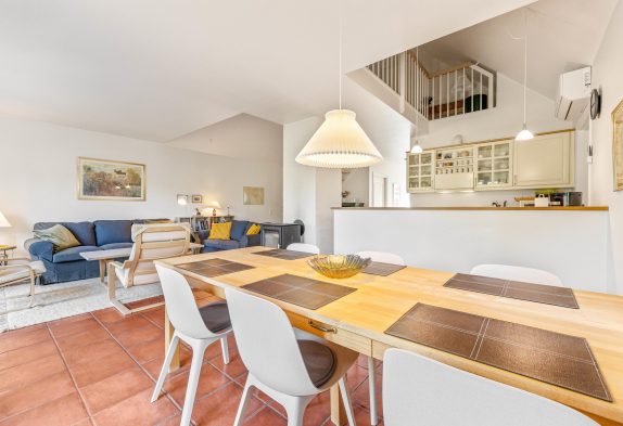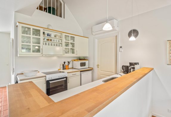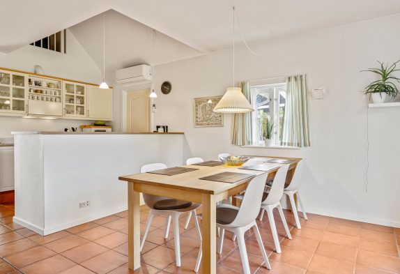 Jeres store samlingspunkt i feriehuset vil helt sikkert være alrummet, hvor køkkenet ligger i åben forbindelse med stue og spiseplads. I alrummet er rammerne sat for hyggelige familiestunder, og med brændeovnens knitren i baggrunden vil feriestemningen være helt i top.