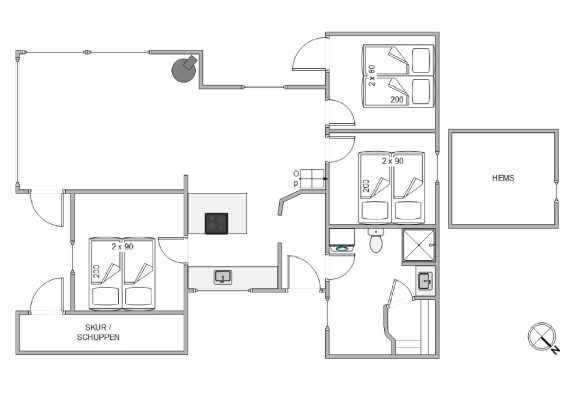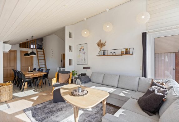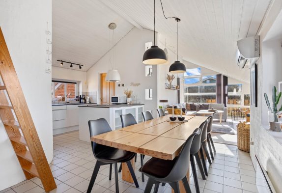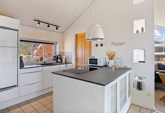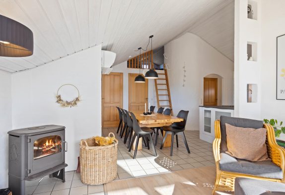 Køkken, stue og spiseplads ligger i åben forbindelse og udgør tilsammen alrummet, der er sommerhusets hjerte, hvor I kan samle hele ferieflokken til hyggelige feriestunder, mens brændeovnen knitrer i baggrunden og fuldender feriestemningen. Fra alrummet har I desuden adgang til en hems, som feriens yngste gæster helt sikkert vil elske.