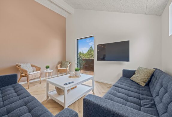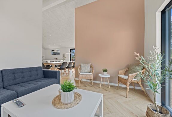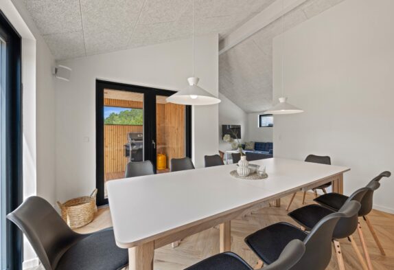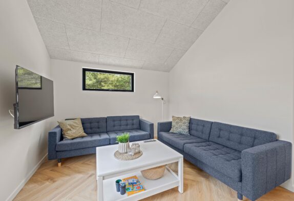 Det moderne sommerhus indbyder til sjove og hyggelige stunder med familien. Sommerhusets hjerterum er opholdsstuen, hvor hele familien kan samles til en hyggelig aften med et spil kort eller en god film i fjernsynet efter en lang og begivenhedsrig feriedag.