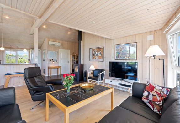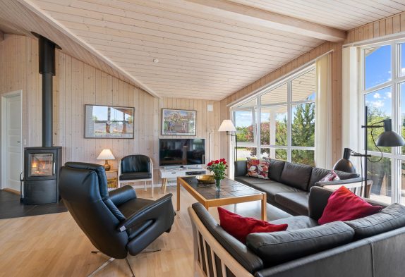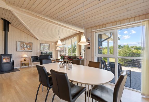 Kernen af feriehuset må være alrummet, her er der masser af plads og rig mulighed for at spille spil med børnene ved spisebordet, eller slynge sig i sofaen med en gang popcorn og en god film. Brændeovnen er centralt placeret, og kan hurtigt sende varmen rundt i feriehuset, så I kan nyde at se flammernes spil.