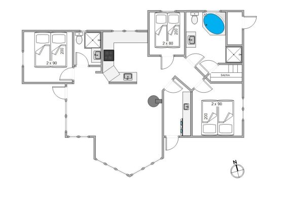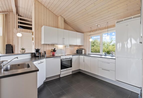Derudover råder feriehuset over 2 badeværelser, begge med gulvvarme, et bryggers med vaskemaskine og tørretumbler, så I også kan klare ferievasken. Til glæde for børnene, finder i også her en hyggelig hems. De store vinduer i alrummet sørger for et godt lysindfald og god mulighed for at nyde haven.