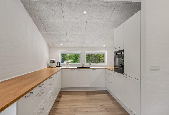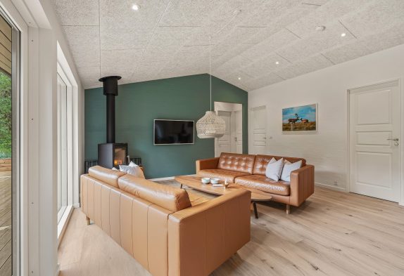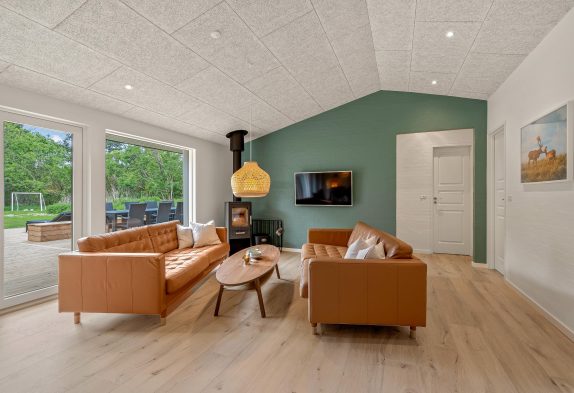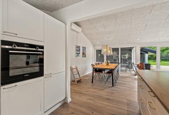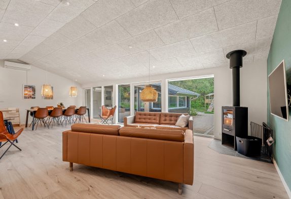 Sommerhusets køkken ligger i åben forbindelse med stuen og spisepladsen, som tilsammen udgør alrummet. Alrummet er hjertet i feriehuset, og her kan I tilbringe hyggelige feriestunder med mad, spil og film, mens brændeovnen knitrer i baggrunden og fuldender feriestemningen.