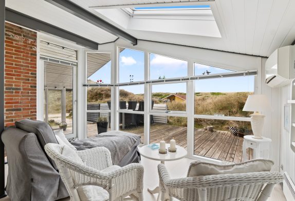 Terrassen ligger delvist i læ fra klitterne og er delvist afskærmet. Her kan du nyde dagene i solen og den friske luft eller finde et skyggefuldt sted, hvor du kan nyde den nyeste krimi. Med udsigt til hede- og klitlandskabet kan du afslutte dagen med en grillaften, imens den nedgående sol lyser aftenhimlen op.