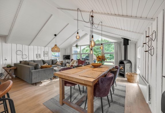 Hjertet og det store samlingspunkt i feriehuset er alrummet, der forener køkken, stue og spiseplads. Alrummet danner rammen om mange hyggelige stunder på jeres ferie, og brændeovnens knitrende flammer sætter prikken over i’et.