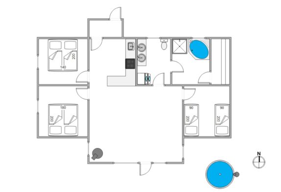 Det 87 kvadratmeter store sommerhus byder desuden på et badeværelse med gulvvarme samt 3 soveværelser. 2 af sommerhusets soveværelser er indrettet med en dobbeltseng hver, mens det tredje soveværelse er indrettet med 2 enkeltsenge.