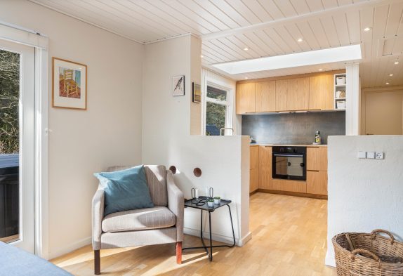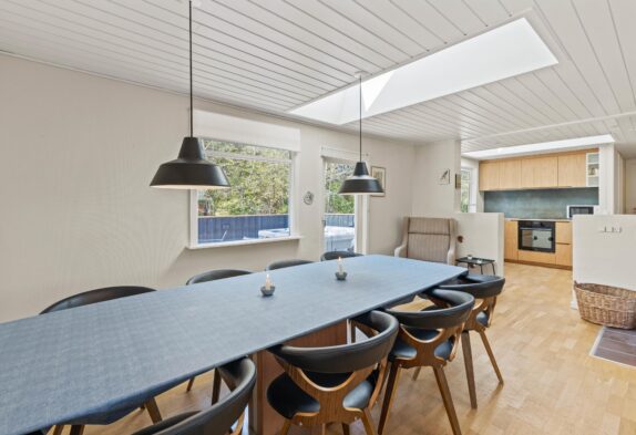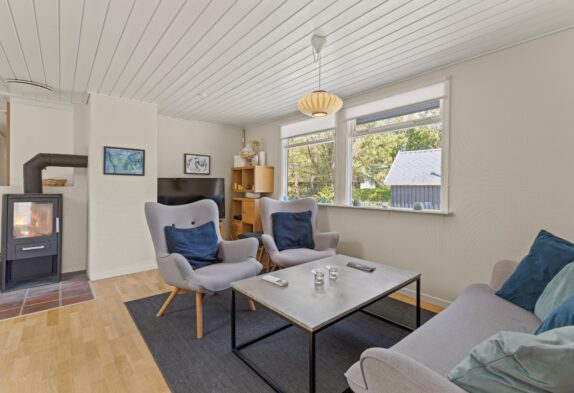 Sommerhusets hjerte, alrummet, udgør jeres store samlingspunkt i feriehuset, hvor I kan samles til hyggelige feriestunder med madlavning i køkkenet, sjove spil omkring bordet og gode film i tv’et. Her bliver den hyggelige feriestemning fuldendt af brændeovnens knitrende flammer i baggrunden.