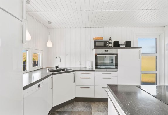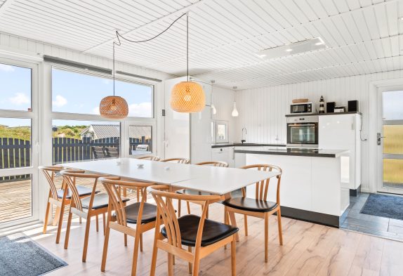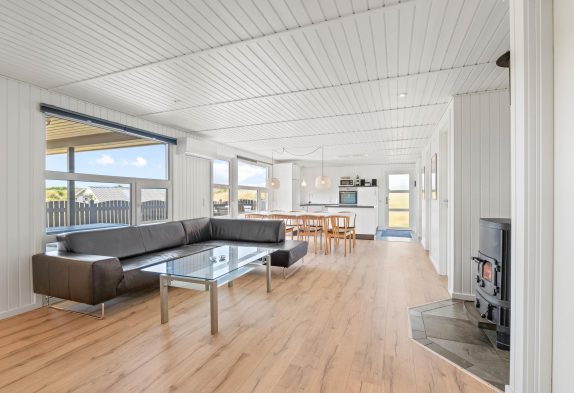 Sommerhuset på Julianevej 88 i Bjerregård er renoveret i 2022. Her er plads til 8 personer og eventuelt et par firbenede venner. Det lyse og praktisk indrettede køkken er åbent i forbindelse med den rummelige stue. Her er spiseplads til 8 personer og en sofaafdeling med brændeovn og fladskærms-TV, så I kan arrangere fælles madlavning i køkkenet samtidig med brætspil ved spisebordet – eller nogle ønsker måske i stedet at læse en god bog foran brændeovnen eller tjekke nyhederne på TV’et.