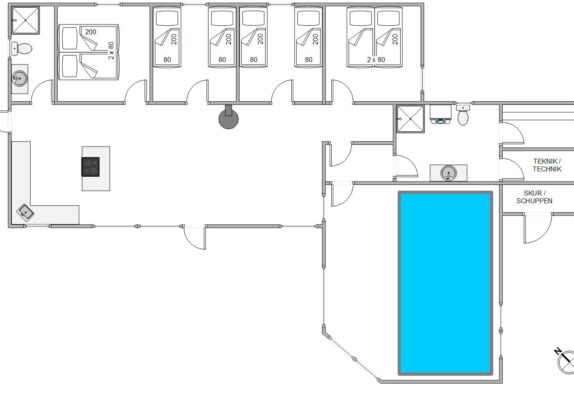 Om I ønsker at benytte wellnessafdelingen morgen, middag eller aften er helt op til jer. Her er swimmingpool og sauna i forbindelse med det store badeværelse. Ved poolen er der også et par stole, så du kan nyde en drink, imens de andre bader. En strømbesparende varmepumpe er separat installeret til opvarmning af poolen.