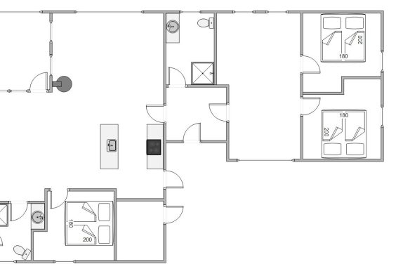 Der er 3 store værelser med dobbeltsenge og 2 badeværelser, hvoraf det ene har adgang til sauna samt udgang til den store terrasse med udespaen mod vest. Ligeledes findes en dejlig stor hems med 2 soverpladser. Der er tænkt på hver en detalje igennem hele feriehuset og ved behov kan i tænde for de energibesparende varmepumper.