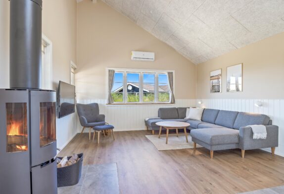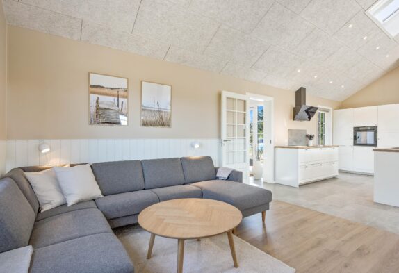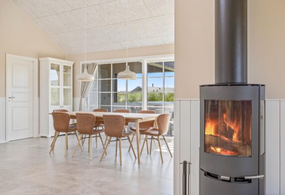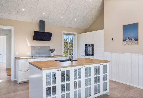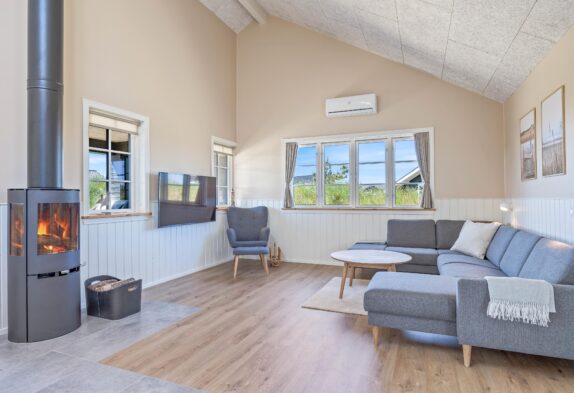 Køkkenet er stort og åbent med loft til kip og masser af lys. Op til feriehusets rummelige køkkenalrum finder I ”hyggekrogen” – stuen, der med den bløde sofagruppe, brændeovnen der knitrer, samt det fine trægulv er med til at skabe den helt rigtige sommerhusstemning.