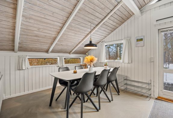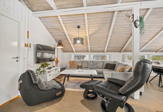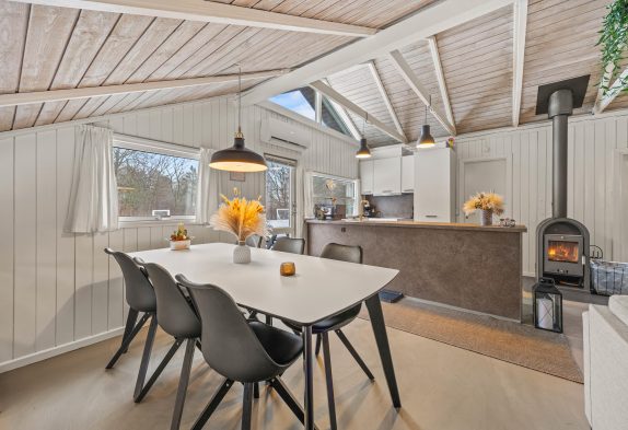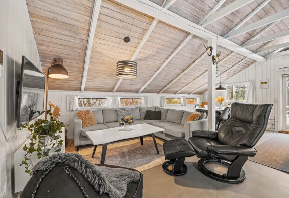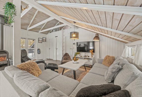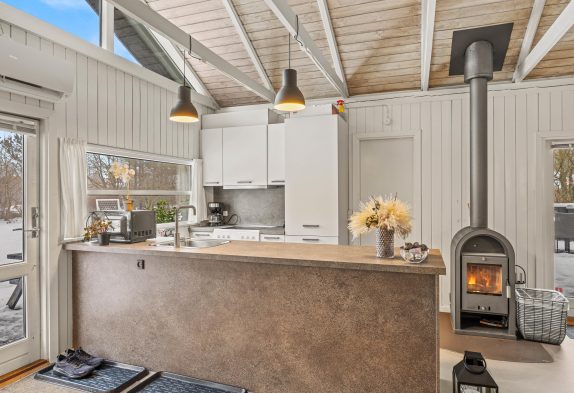 I stue-delen er der en stor sofa med plads til hele familien. Her kan I samles om et spil ved sofabordet, læse den medbragte ferielæsning eller se en film sammen på stuens TV, hvor det er muligt at streame. I sommerhuset finder E også en PlayStation 4, så der er mulighed for underholdning på de regnfulde dage. Skal feriehuset varmes op eller elsker I bare lyden af knitrende ild, kan I tænde op i brændeovnen.