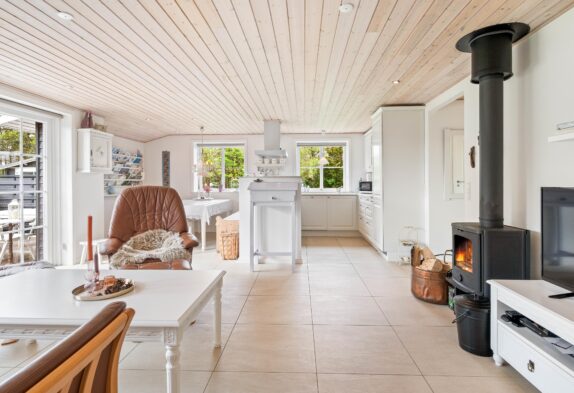 Sommerhuset bliver opvarmet med en energibesparende varmepumpe og den traditionelle brændeovn, der også sørger for ægte sommerhusstemning på køligere dage, hvor I kan sidde og nyde flammerne i ovnen. I spisestue og badeværelse er der også gulvvarme, og de praktiske og store fliser gør det også nemt for jer at gøre rent. Hele sommerhuset er velholdt og de store vinduespartier i stuen sørger for et godt lysindfald, der er med til at skabe en skønt og hjemmeligt miljø.