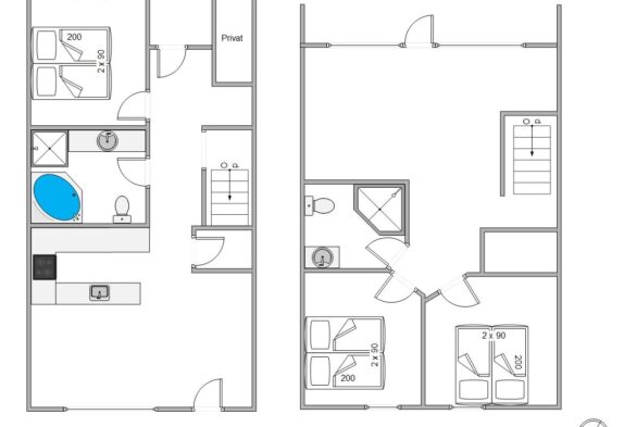 Her finder I også badeværelset med spabad og gulvvarme samt ét af de i alt 3 soveværelser, hvoraf de 2 andre ligger på 1. salen – alle er indrettet med dobbeltsenge. De resterende 2 sovepladser ligger på hemsen, som er udstyret med ekstra madrasser.