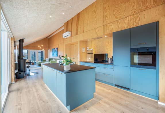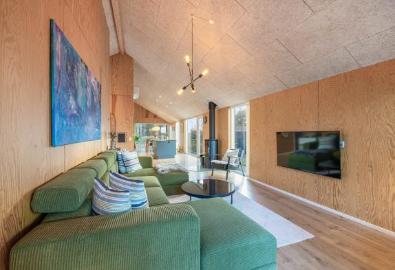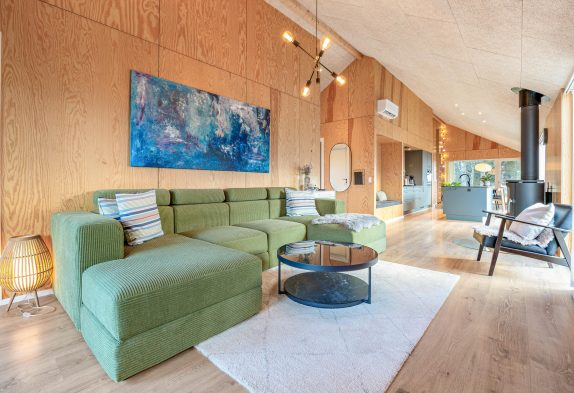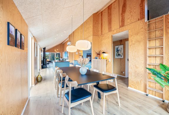 Hjertet i det 120 kvadratmeter store sommerhus er det store, lyse alrum, der danner rammen om mange hyggelige stunder i løbet af ferien. Mens I laver mad, spiller spil eller ser film i alrummet, fuldender brændeovnen den hyggelige stemning med sin knitren i baggrunden.