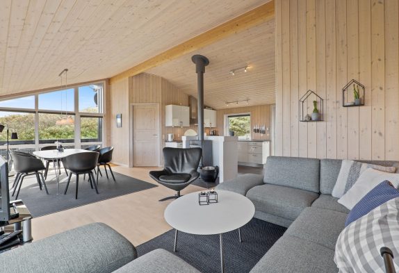 Den typiske skandinaviske hygge byder dig velkommen, så snart du træder ind i dette skønne sommerhus. Det åbne stue- og spiseområde har en bred glasfront, der skaber et flot lysinfald. Den hyggelige sofa inviterer til en afslappende filmaften med hele familien. TV’et med chromecast og dvd- afspilller byder på mange muligheder.