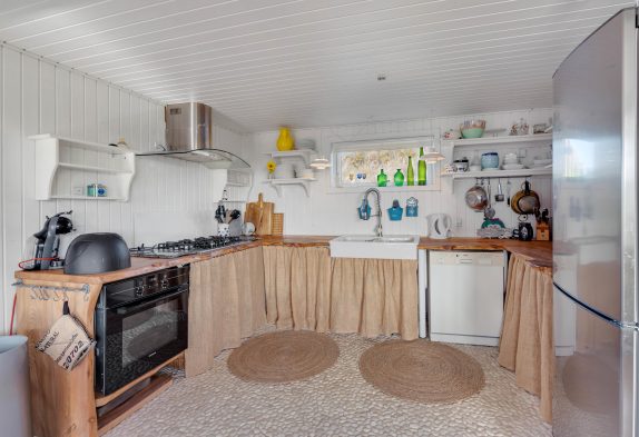 Sommerhusets køkken, spiseplads og stue ligger i åben forbindelse, og tilsammen udgør det alrummet, som kommer til at være jeres samlingspunkt på ferien. I alrummet kan I både lave mad, spille spil og se film, mens brændeovnen knitrer i baggrunden og spreder en dejlig varme i rummet.