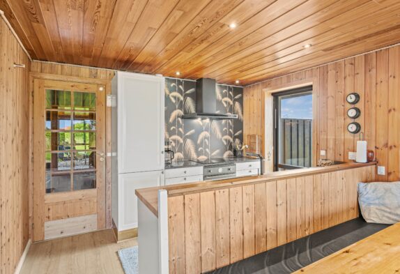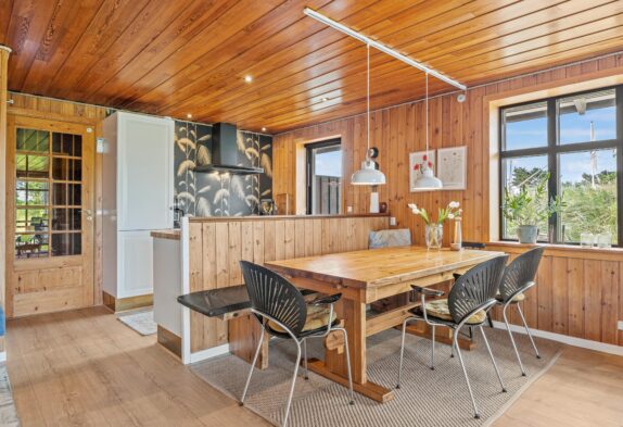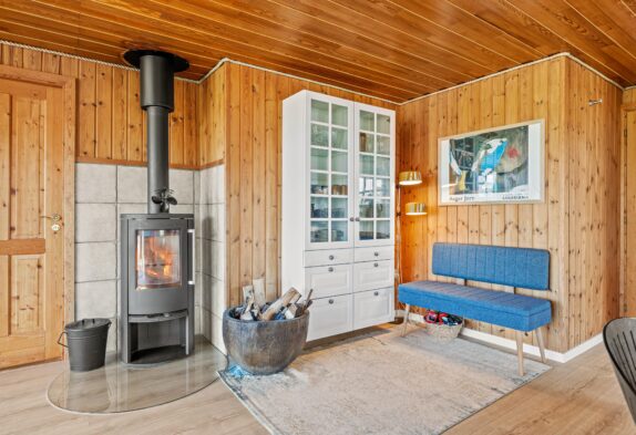 Den hyggelige feriestemning i alrummet bliver fuldendt af brændeovnen, der knitrer i baggrunden og spreder god varme i rummet. Derudover er der en energivenlig varmpumpe i feriehuset, der sørger for gode indendørs temperaturer.