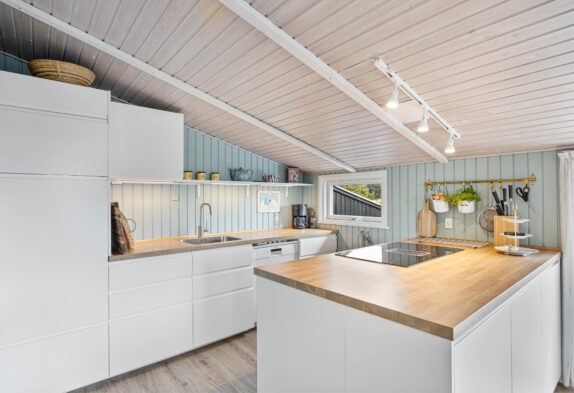 I det lyse og praktisk indrettede køkken finder du alt, hvad du behøver for at fremtrylle et lækkert måltid, og opvaskemaskinen tager sig af opvasken. I de kølige måneder kan sommerhuset hurtigt opvarmes med den energibesparende varmepumpe. Du kan ovenikøbet nyde en afslappende tur i saunaen, hvis du trænger til at blive grundigt gennemvarm.