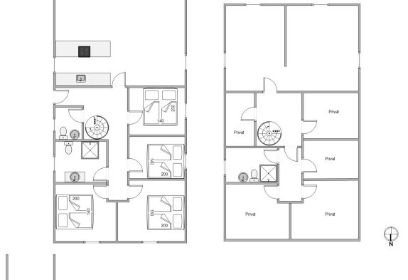 Den praktiske opdeling i 2 etager gør, at man altid kan trække sig tilbage og rekreere lidt for sig selv. I øverste etage er 4 soveværelser med dobbeltsenge, 1 gæstetoilet og 1 badeværelse med bruser. På etagen ovenover er endnu et badeværelse med bruser. Alle toiletter og badeværelser har gulvvarme.