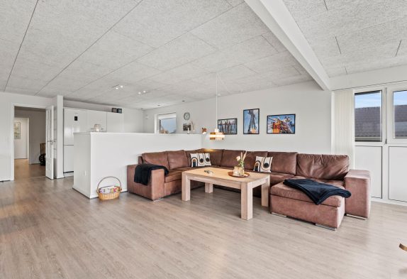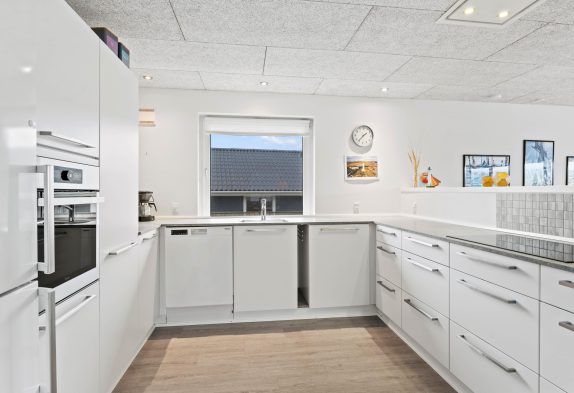 Sommerhuset er opdelt i en soveafdeling og en opholdsafdeling. I opholdsafdelingen er køkkenet åbent i forbindelse med alrum og stue. I det veludstyrede køkken finder du opvaskemaskine, mikroovn, køleskab og induktionskomfur. Lystfiskere vil blive glade for en 60 liters fryser. Her kan I sammen fremtrylle et lækkert måltid i det åbne køkken, eller se en film i stuen senere om aftenen. Det fine lysindfald giver et smukt og lyst udtryk, og indbyder til at hygge sig her.