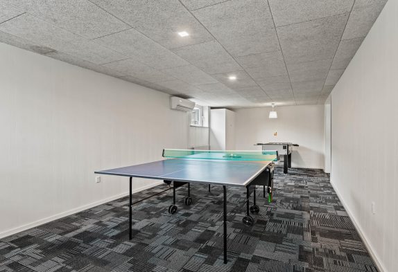 I den nederste etage finder du det andet badeværelse med vaskemaskine og tørretumbler, samt endnu en stue med en behagelig sofa og tv. Praktisk, hvis I vil se forskellige tv-programmer samtidig. For dem, der gerne vil bruge ekstra energi på ferien, findes også aktivitetsrummet hernede.