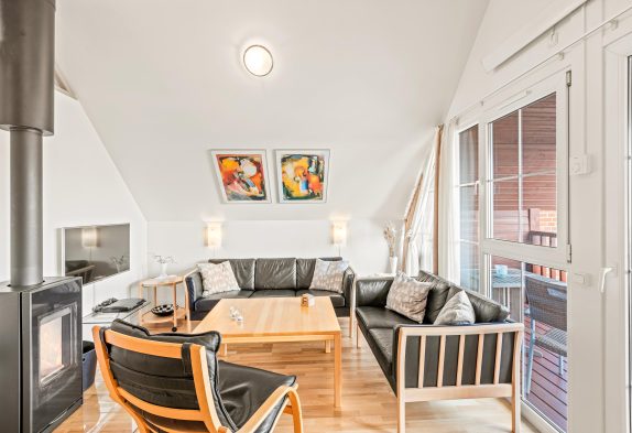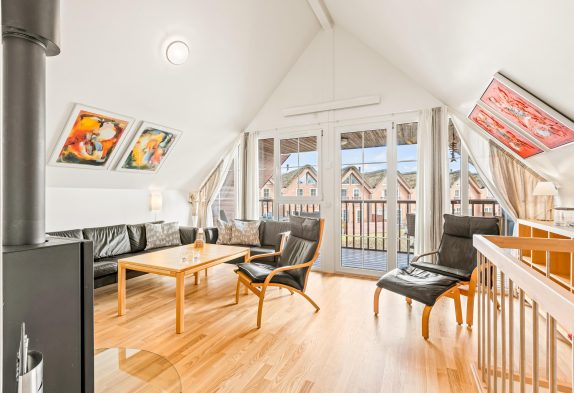 På 1. sal finder i en hyggelig opholdsstue med loft til kip, her kan I nyde de hyggelige aftenstunder foran brændeovnen. Herfra er der udgang til en overdækket altan, hvor de morgenfriske kan opleve de mest fantastiske solopgange over Vadehavet. Desuden er der 2 soveværelser med dobbeltsenge på første sal og et komplet badeværelse med gulvvarme. Fra opholdsstuen er der adgang til en hems med 2 madrasser.