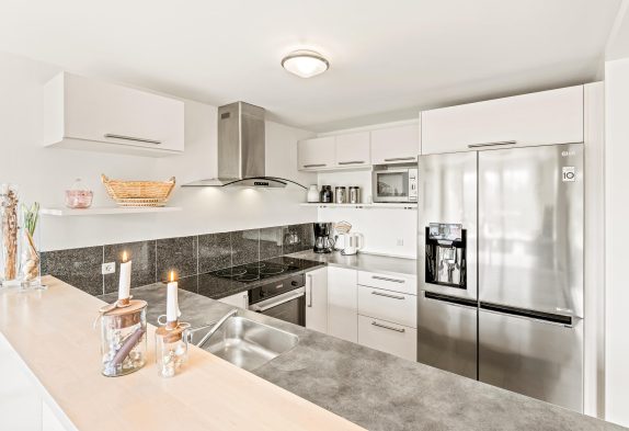 Det stråtækte rækkehus på 2 plan byder plads til op til 8 personer og er udstyret med gode faciliteter for at nyde ferielivet fuldt ud. I stueplanen finder I et lyst køkken med amerikansk køleskab, opvaskemaskine og mikrobølgeovn. Køkkenet ligger i åben forbindelse med spisestuen, hvor hele familien kan samles til lækre måltider eller en hyggelig spilleaften. Også i stueetagen ligger et af de tre soveværelser med dobbeltsenge samt et badeværelse med gulvvarme. Her kan I slappe af og nyde en dejlig vandmassage i spabadet.