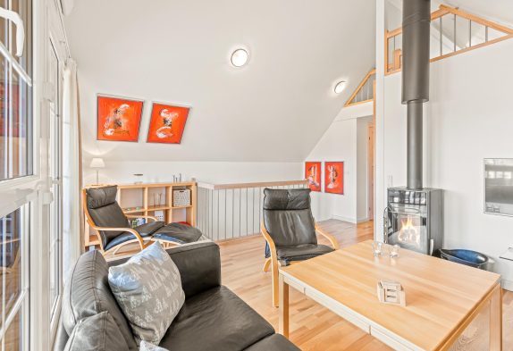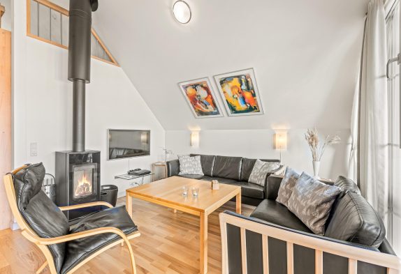 Spabad, brændeovn og moderne indretning fordelt på 2 plan