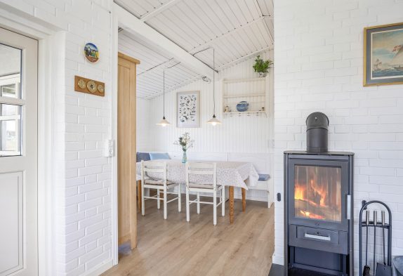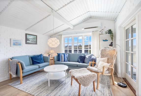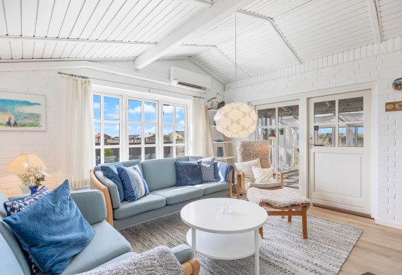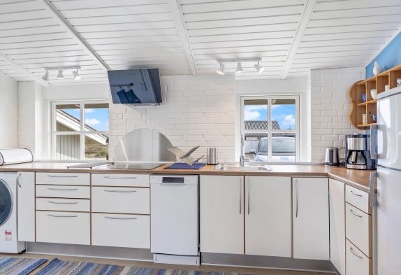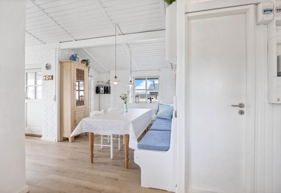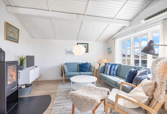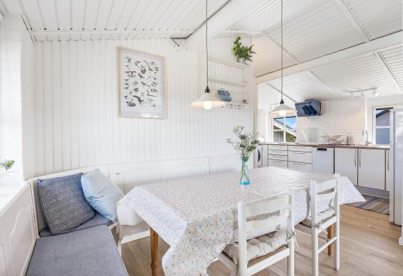 I den lyse opholdsstue kan I slappe af sammen foran brændeovnen eller se en film. Det brede vinduesparti giver et fint lysindfald, hvilket skaber en behagelig atmosfære. I det veludstyrede køkken kan du lave mad af hjertens lyst. Spisebordet giver plads til en hyggelig aften med lækker mad og eventuelt et brætspil. Udover brændeovnen hjælper den energibesparende varmepumpe også til med opvarmning.