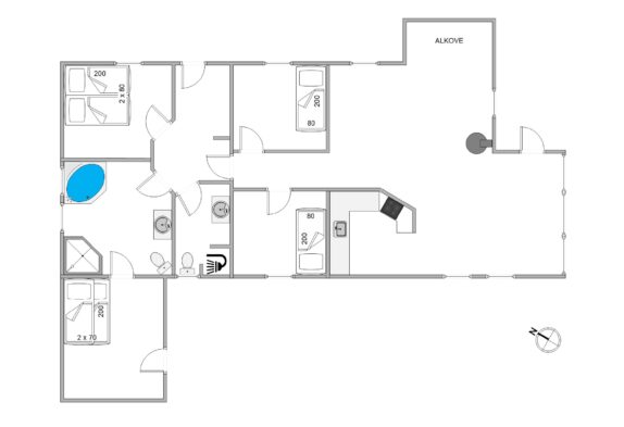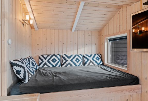 I stuen finder I en alkove, og derudover har feriehuset et værelse med 1 dobbeltseng, et værelse med 1 enkeltseng og et med en køjeseng. Værelset med køjeseng er et optimalt børneværelse, da der er god plads til leg og kreativitet.