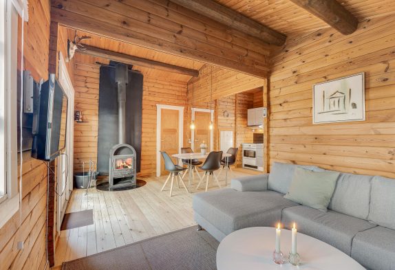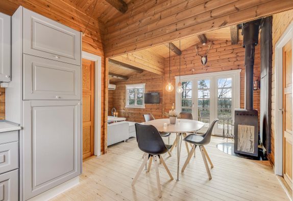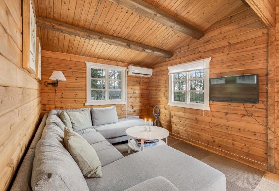 Træhuset er indrettet lyst og hyggeligt. I stuen findes der findes en brændeovn, som sørger for behagelig varme de kølige aftener. For energivenlig opvarmning findes der en varmepumpe, som holder varmeomkostninger ned.