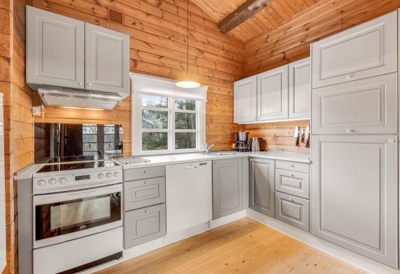 Køkkenet er udstyret med opvaskemaskine, mikroovn og en fryser (60L) og ligger i åben forbindelse med spisestuen og stuen.