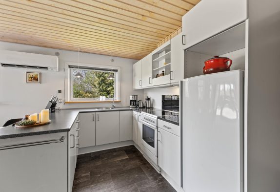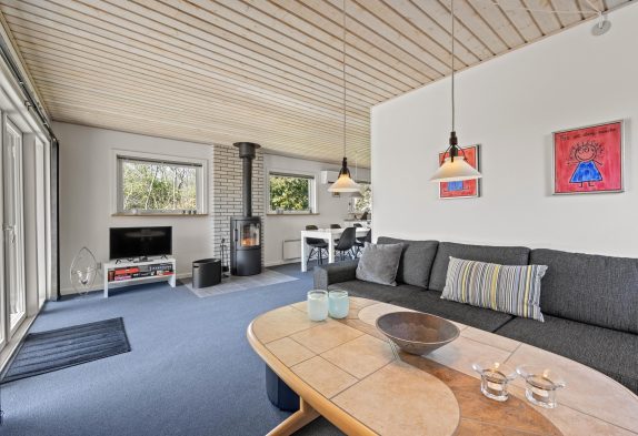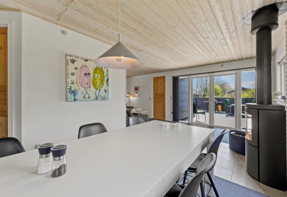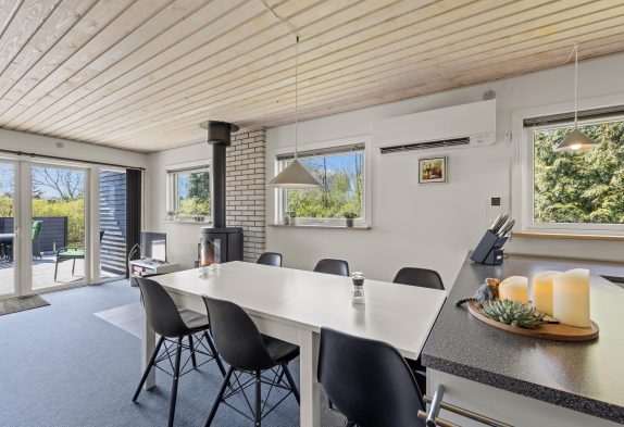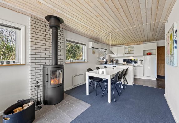 Uanset om I sidder ved spisebordet eller i sofaen, ville I kunne nyde varmen fra brændeovnen samt den hyggelige knitren, der giver en skøn sommerhusstemning. Sommerhuset har også en energibesparende varmepumpe, der hurtigt kan varme rummet op og samtidig sørger for godt indeklima.