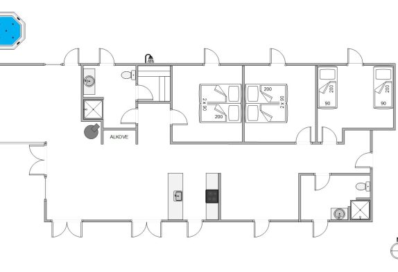 Feriehuset har 3 gode soverum samt 2 badeværelser, som begge er med bruseniche og gulvvarme. På det ene badeværelse finder I endda også en dejlig sauna, hvor I kan læne jer tilbage og dampe af efter en dag på Vestkysten.