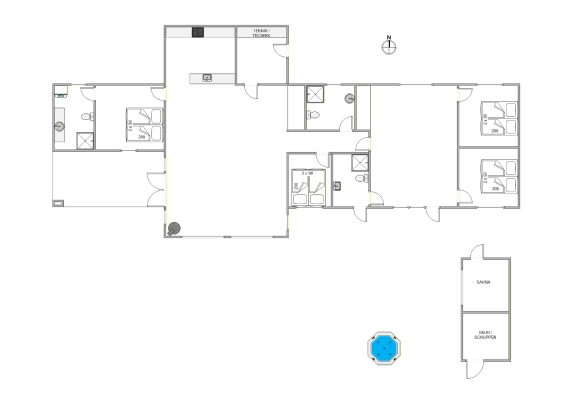 Her er 3 badeværelser med gulvvarme og bruser, hvor det ene ligger i forbindelse med et soveværelse. Feriehuset har selvfølgelig også praktiske hjælpere som vaskemaskine og tørretumbler. En Varmepumpe sørger for strømsparende varme i huset, og jer der er ejer af en el-bil, kan glæde sig over en ladestation på huset.