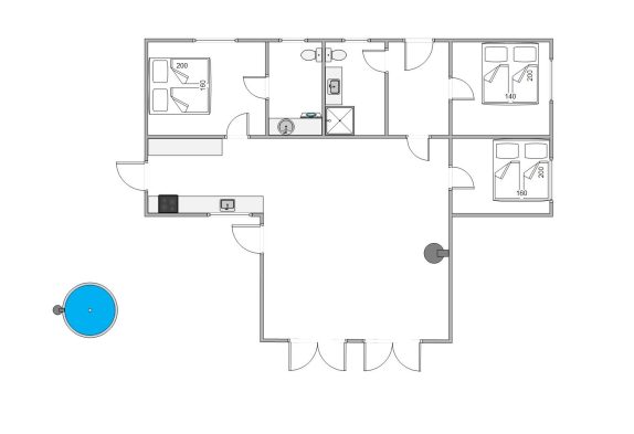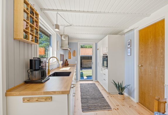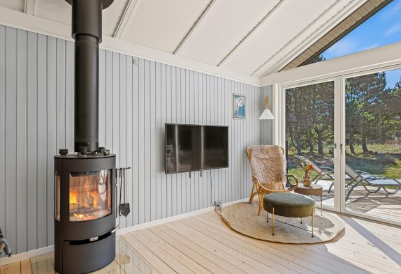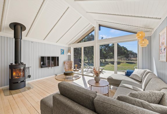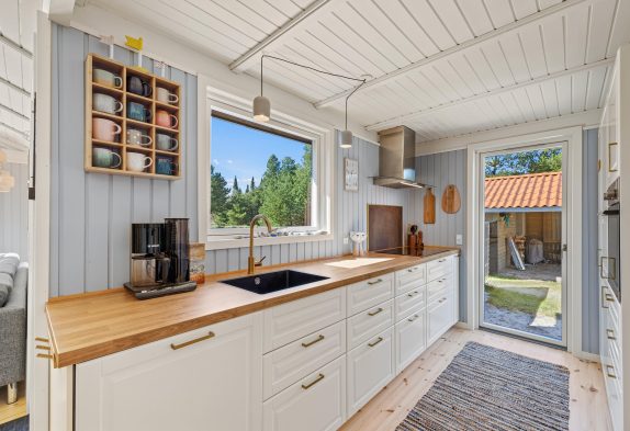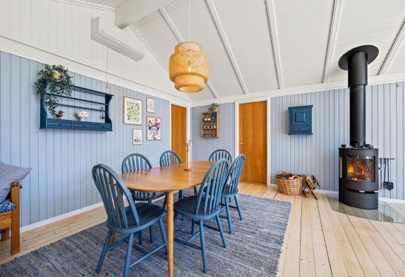 Kernen i dette feriehus er den hyggeligt indrettede stue i åben forbindelse med køkkenet. Køkkenet er udstyret med alt, hvad I behøver til feriens madlavning. Bliver det lidt køligt, så kan I tænde op i brændeovnen og mærke varmen brede sig i hele sommerhuset. Der er 3 soveværelser til jeres rådighed, hvor I kan få en god nats søvn efter en aktiv dag, så I kan starte næste dag veludhvilede. Det ene soveværelse har adgang til et lille toilet. Her finder I også vaskemaskinen, og der er i øvrigt indlagt gulvarme. Der er også et andet badeværelse i sommerhuset med bruser, toilet og gulvvarme, der ligger ved siden af de øvrige soveværelser.