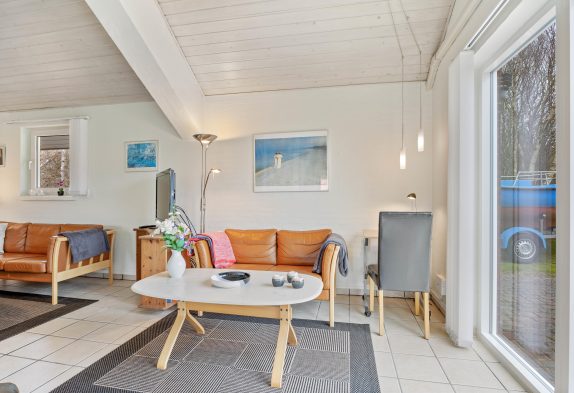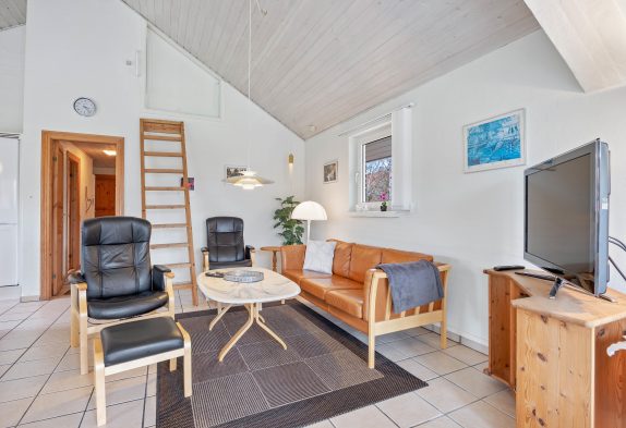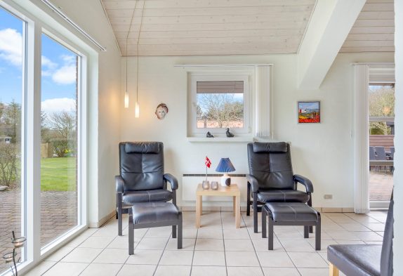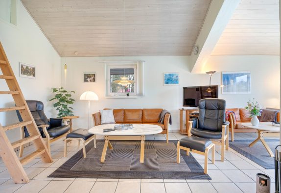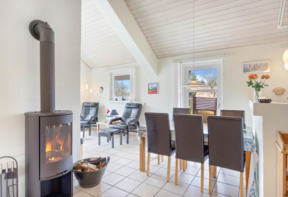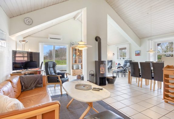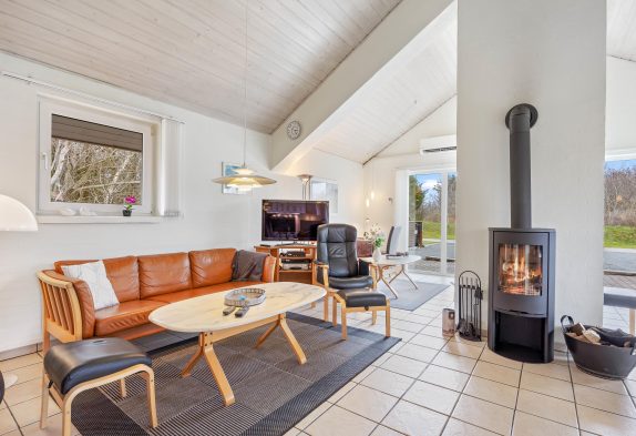 Stuen har også et skønt sofaområde med en brændeovn og masser af hyggekroge og behagelige lænestole. Loftet er til kip, hvilket giver en dejlig luftig følelse i rummet. De 3 soveværelser er indrettet med god skabsplads og er perfekte til en god nats søvn efter en lang dag med aktiviteter og afslapning.