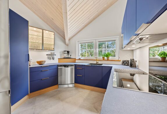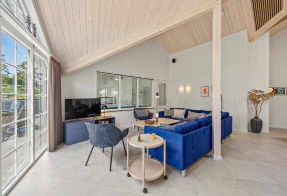 Sommerhuset er bygget i 2023, og når I træder indenfor, bliver I mødt af en moderne og lys indretning, som I helt sikkert vil føle jer godt tilpasse i.