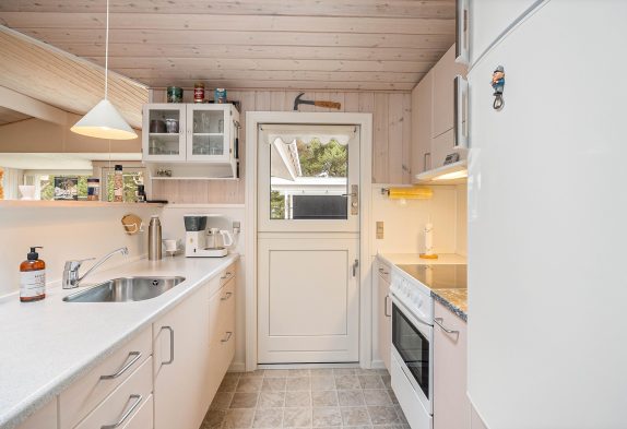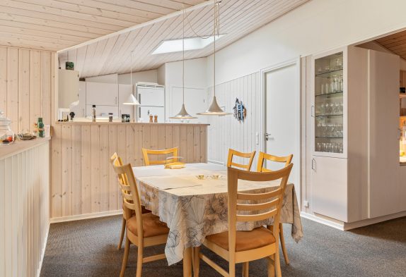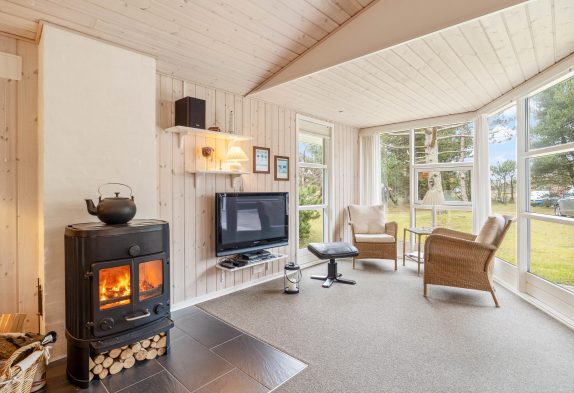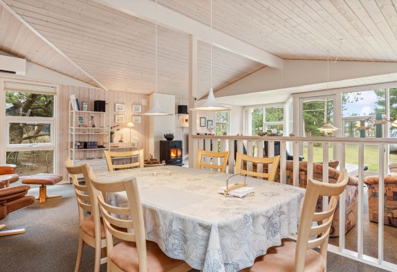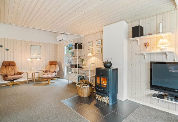 Hjertet i sommerhuset er alrummet, der forener køkken, spiseplads og stue. Her er rammerne altså sat for hyggelige feriestunder med film, spil og madlavning. I alrummet er der desuden en brændeovn, der fuldender den hyggelige stemning med sin knitren i baggrunden.