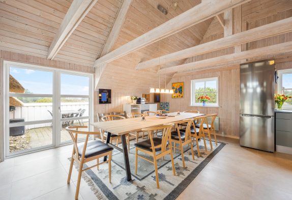 Det i 2023 renoverede feriehus er udført i 2 plan, med en lys og let indretning. Samlingspunktet i feriehuset er det rummelige alrum med kig til pool rummet, der ligger et niveau lavere. Alrummet indeholder spiseplads samt et stilfuldt køkken med opvaskemaskine og induktionskomfur. Her kan I hygge jer sammen omkring madlavning eller et brætspil ved spisebordet, imens familiens vandhunde hygger sig i poolen. I alrummet befinder husets brændeovn sig, som sørger for en hyggelig stemning. Derudover er der gulvvarme i hele alrummet.