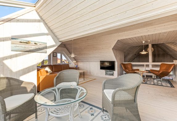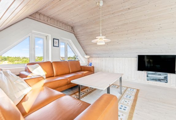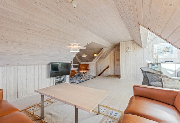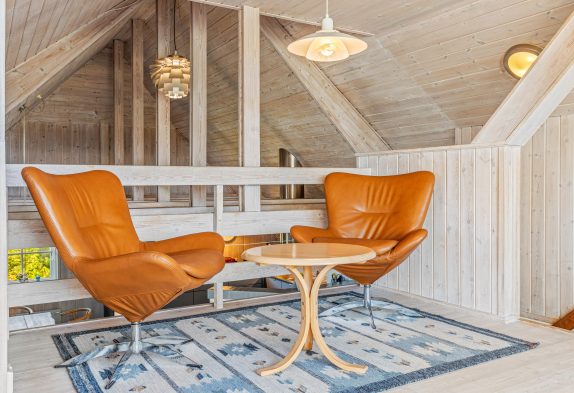 Opholdsstuen befinder sig på første sal, med åbent kig ned til alrummet. Her har I et storslået lysindfald fra det store vinduesparti, og de mange siddepladser giver jer mulighed for at samles her til hyggeligt samvær.