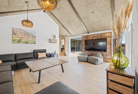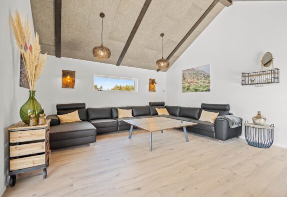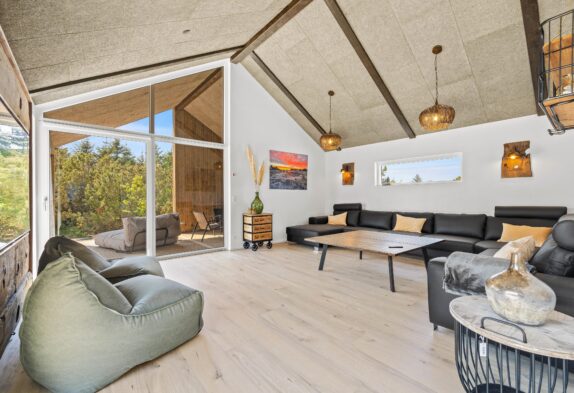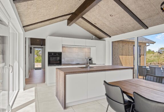 I feriehusets indretning er der lagt vægt på luksus, kvalitet og komfort, så I vil straks føle jer hjemme dette feriehus. Loft op i kip og panoramavinduer booster feriestemningen og gør sommerhuset til en oase af velvære. Det naturlige samlingssted bliver opholdsrummet, som er åbent i forbindelse med det veludstyrede køkken med induktionskogeplade og opvaskemaskine. Her er god plads til, at I kan mødes og hygge med at lave mad sammen, som bagefter kan nydes ved det flotte spisebord og den smukke udsigt gennem det store vinduesparti. Den store lækre sofa indbyder til fælles hygge eller I kan streame jeres yndlingsfilm via cromecast til en hyggelig filmaften.