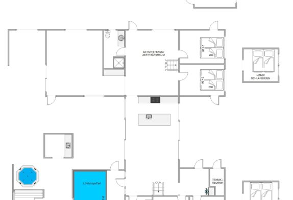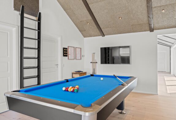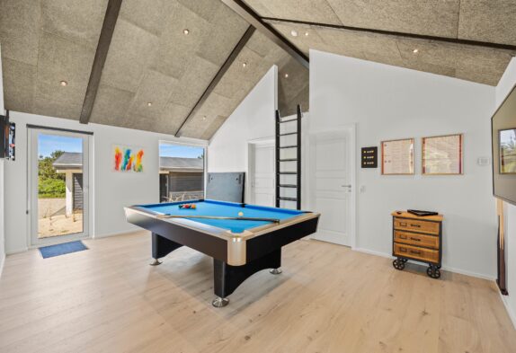 I aktivitetsrummet stimuleres konkurrencegenet med poolbillard, bordtennisbord og dartspil, der er klar til lidt intern konkurrence. De 4 soveværelser er fordelt, så I kan trække jer tilbage til de komfortable dobbeltsenge uden at blive forstyrret af alle andre. Desuden er der 2 hemse, som hver har 2 sovepladser, et oplagt sted at sove for de yngre gæster. De 2 badeværelser med bruseniche og gulvvarme er smukt og enkelt indrettet.