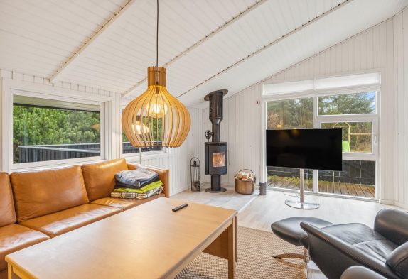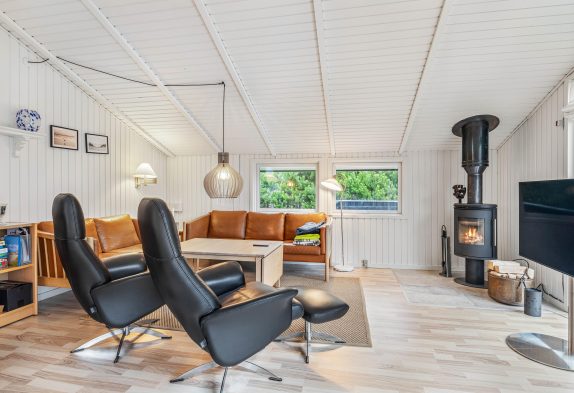 Alrummet byder også på en hyggelig brændeovn, der sætter prikken over i’et for feriestemningen med sin knitren i baggrunden. Derudover spreder brændeovnen også en dejlig varme i alrummet. Desuden er sommerhuset også udstyret med en energivenlig varmepumpe, der sørger for gode indendørs temperaturer.