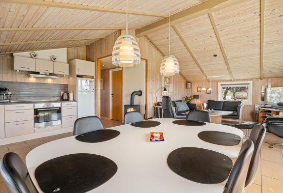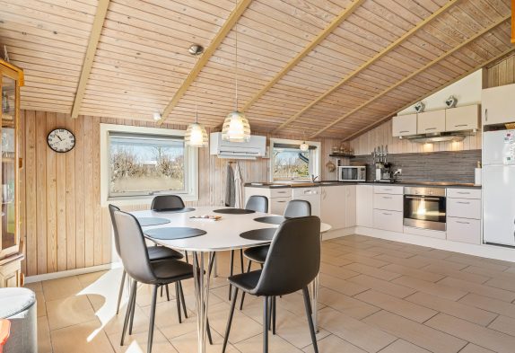 Det åbne køkken er kombineret med den rummelige og lyse stue. Her kan I lave mad, hygge med brætspil om spisebordet eller tænde op i brændeovnen, mens I kan slå jer ned i de behagelige møbler med film og knitren fra brændeovnen i baggrunden – det er da ren afslapning og feriestemning! Udover brændeovnen kan I også opvarme sommerhuset med den energibesparende luft til luft varmepumpe. Derudover er der også gulvvarme i det store køkkenalrum, som er flisebelagt.