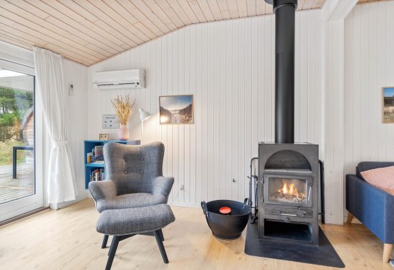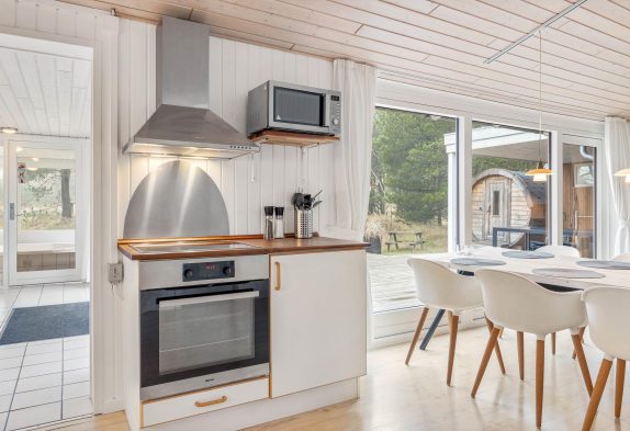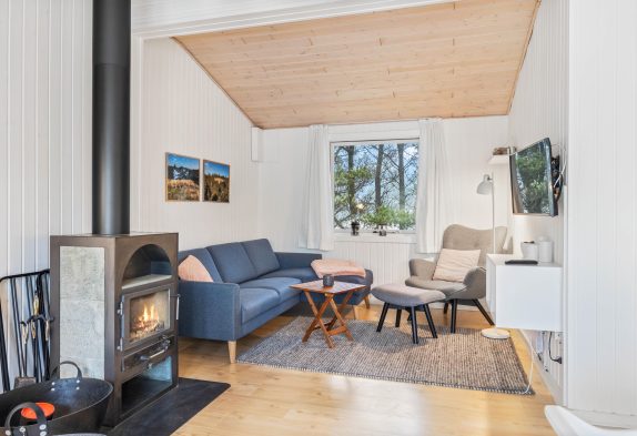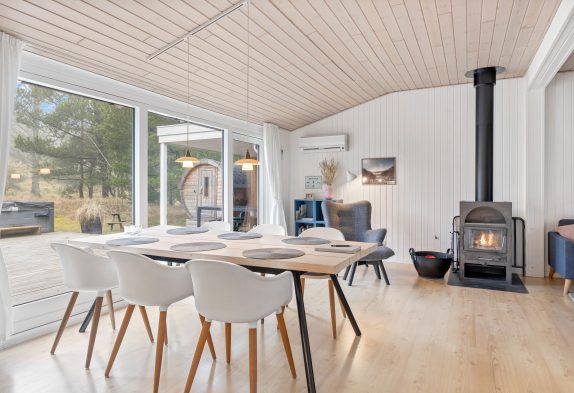 Det lyse og rummelige opholdsrum med åbent køkken og spiseplads indbyder til mange timers hygge. Her kan I lave mad sammen, spise sammen, spille spil og se tv. De store vinduespartier lukker masser af naturligt lys ind, og samtidig kan I nyde udsigten til den skønne omkringliggende natur, mens pejsen knitrer og spreder hygge.
